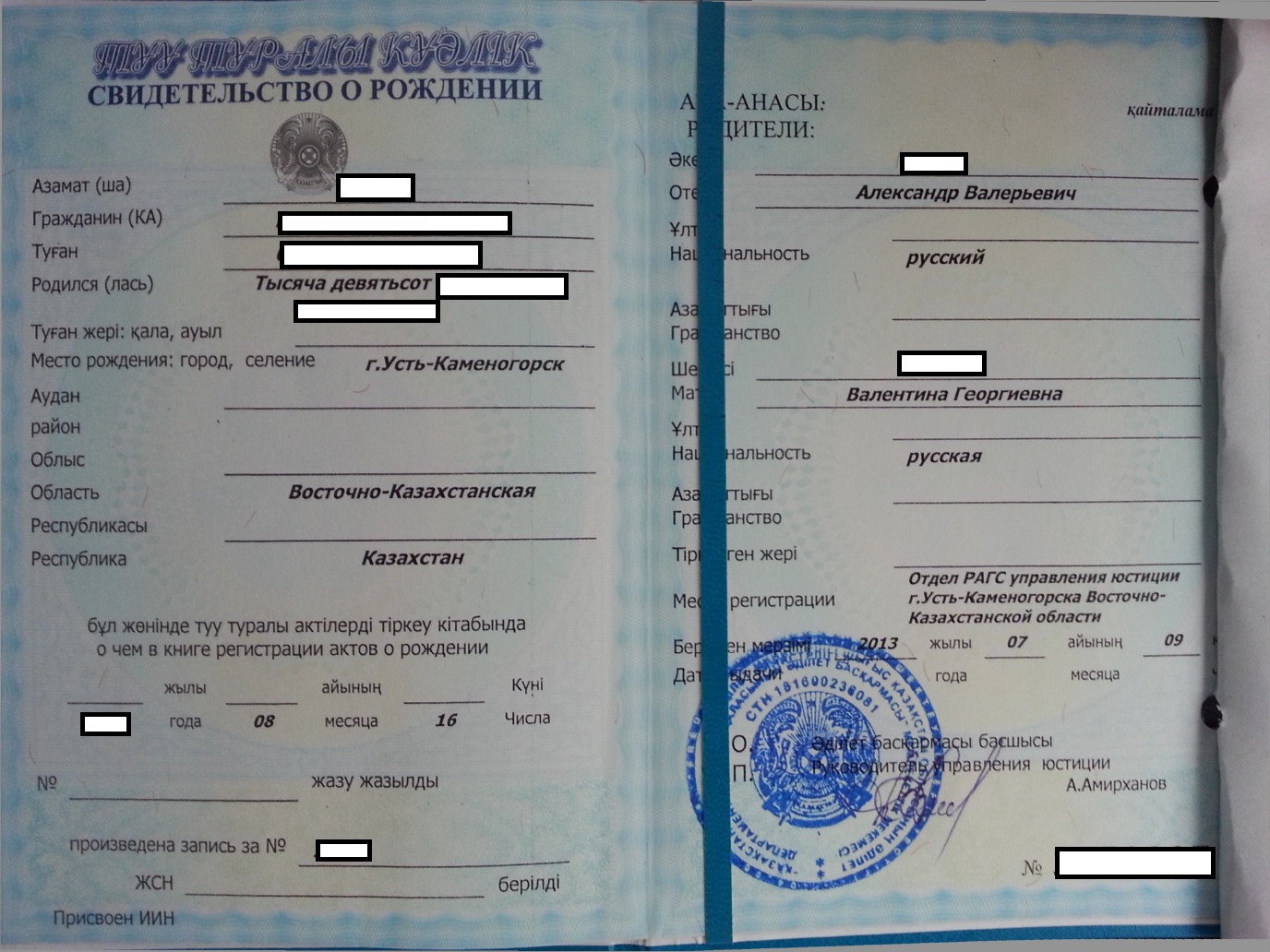 Образец свидетельства о рождении Республики Казахстан